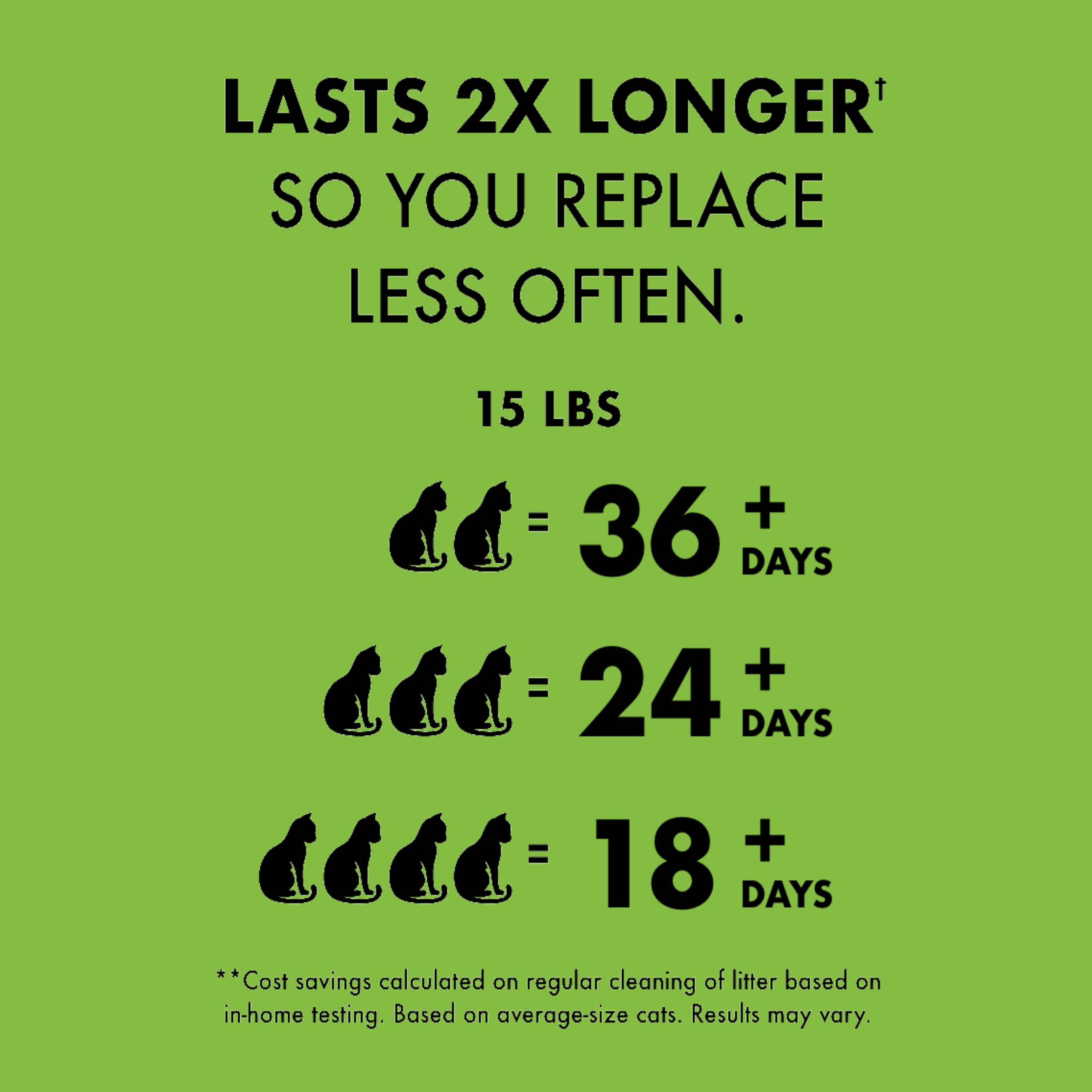 Get the clumping litter with outstanding odor control and a tight clumping ability. Not only is it easy to scoop, but it’s also flushable* and septic safe — so the dirty litter isn’t filling your trash. Smell less, clean less and buy less with the original choice for 2X longer-lasting performance than the leading US litter brand.