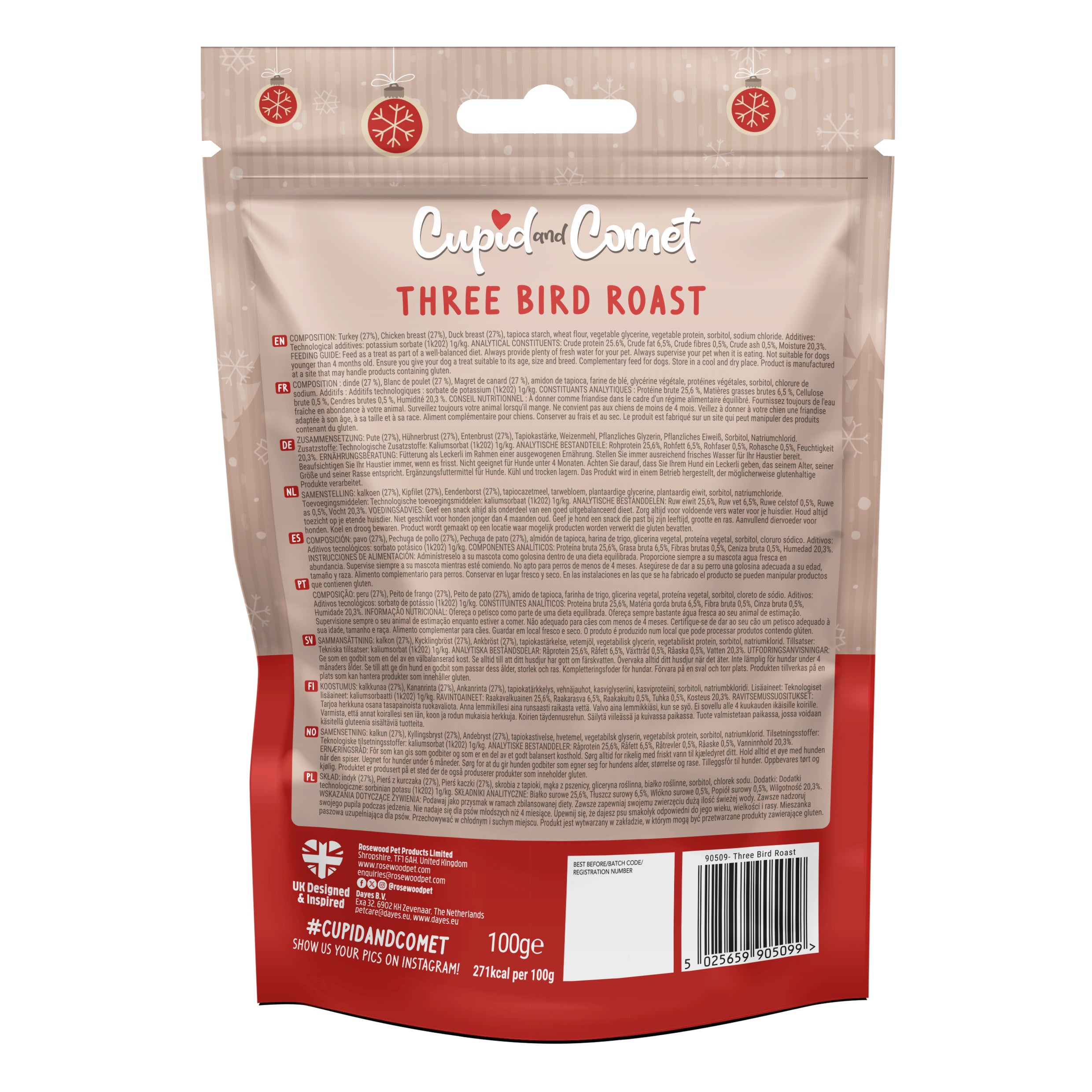 Treat your dog to a festive feast with the Rosewood Cupid & Comet Three Bird Roast Meaty Strips – a 100g pack of tender, tasty treats inspired by the classic Christmas roast.