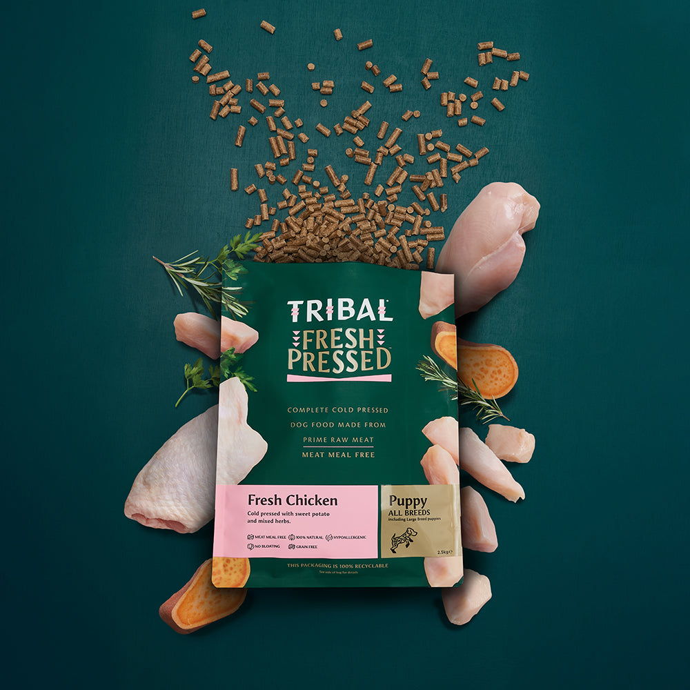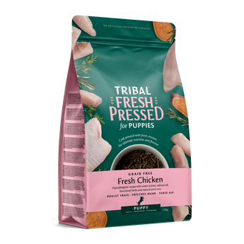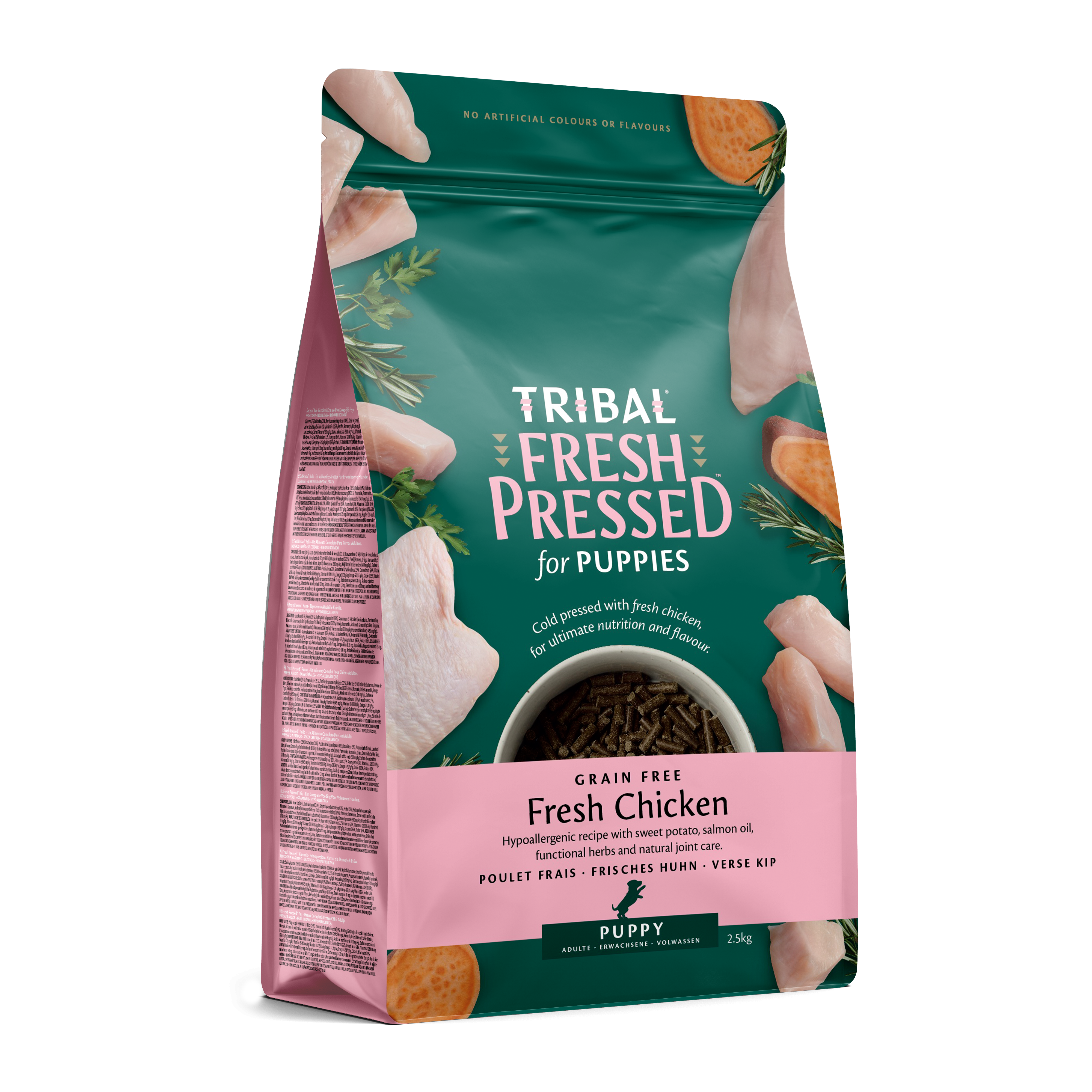 A grain free & natural, cold pressed complete dog food with fresh chicken specially developed for growing puppies of all breeds, including large breed puppies.
