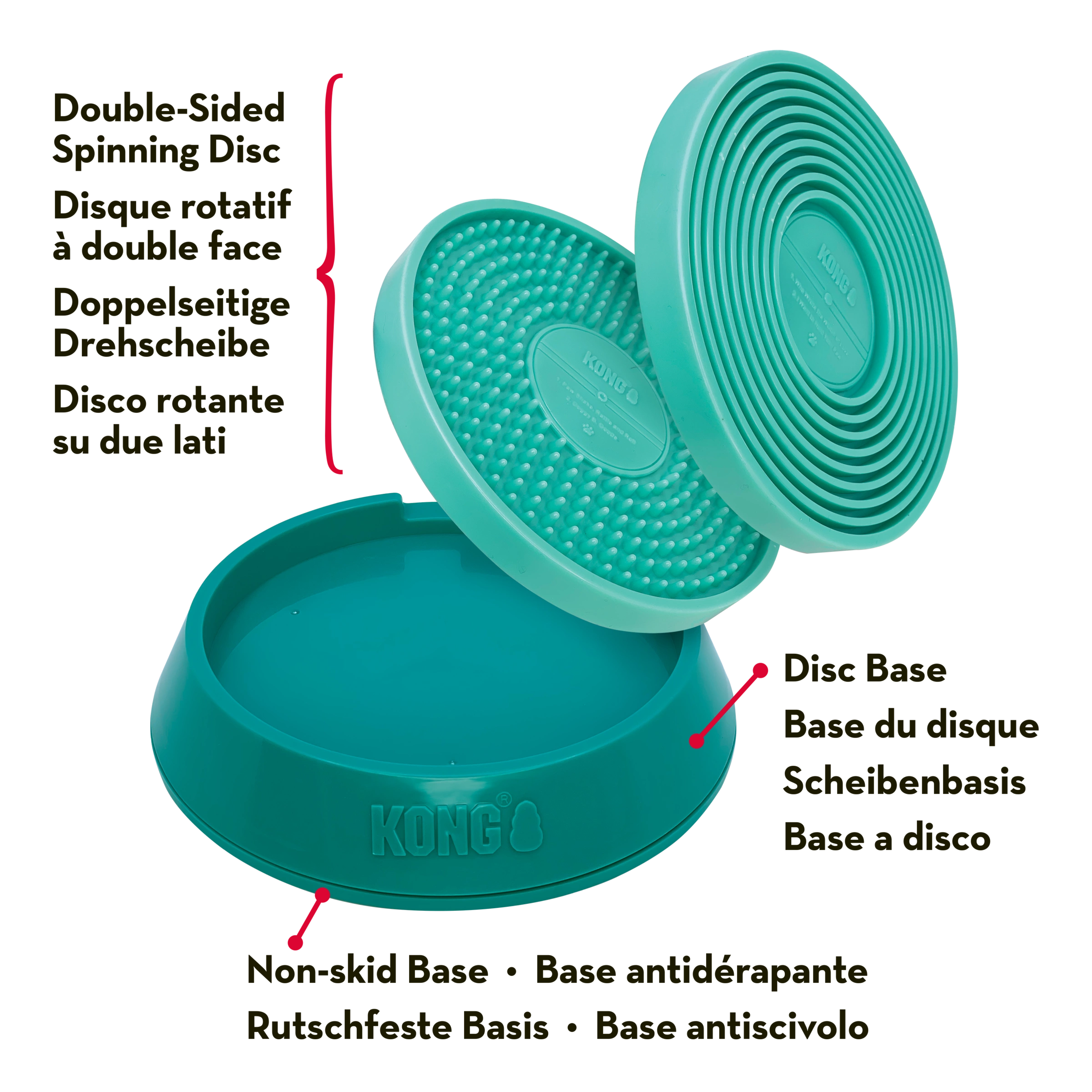 KONG Licks Spinz’ rotating, textured pad holds food or treat paste, inviting DJ K9 to lick, releasing happy hormones as he rocks out. Double-sided pad offers two textures for enriching variety (as well as multiple tracks: “I Wanna Hold Your Paw” and “Doggy Be Good”) and is removable for easy cleaning. Plus, getting down with this turntable cleans dogs’ tongues, promoting dental health and fresh breath. Non-skid base holds toy in place.
