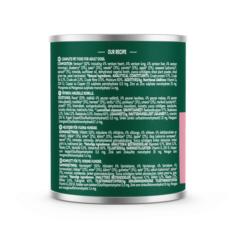 Venison 52% inc. 4% heart, 4% lung, 4% liver, 4% trimmings, Blueberry 3%, Peas 3%, Apples 2%, Swede 3%, Carrots 3%, Spinach 1%, Minerals, sunflower oil, dehydrated vegetal broth, green tea extract, yucca extract