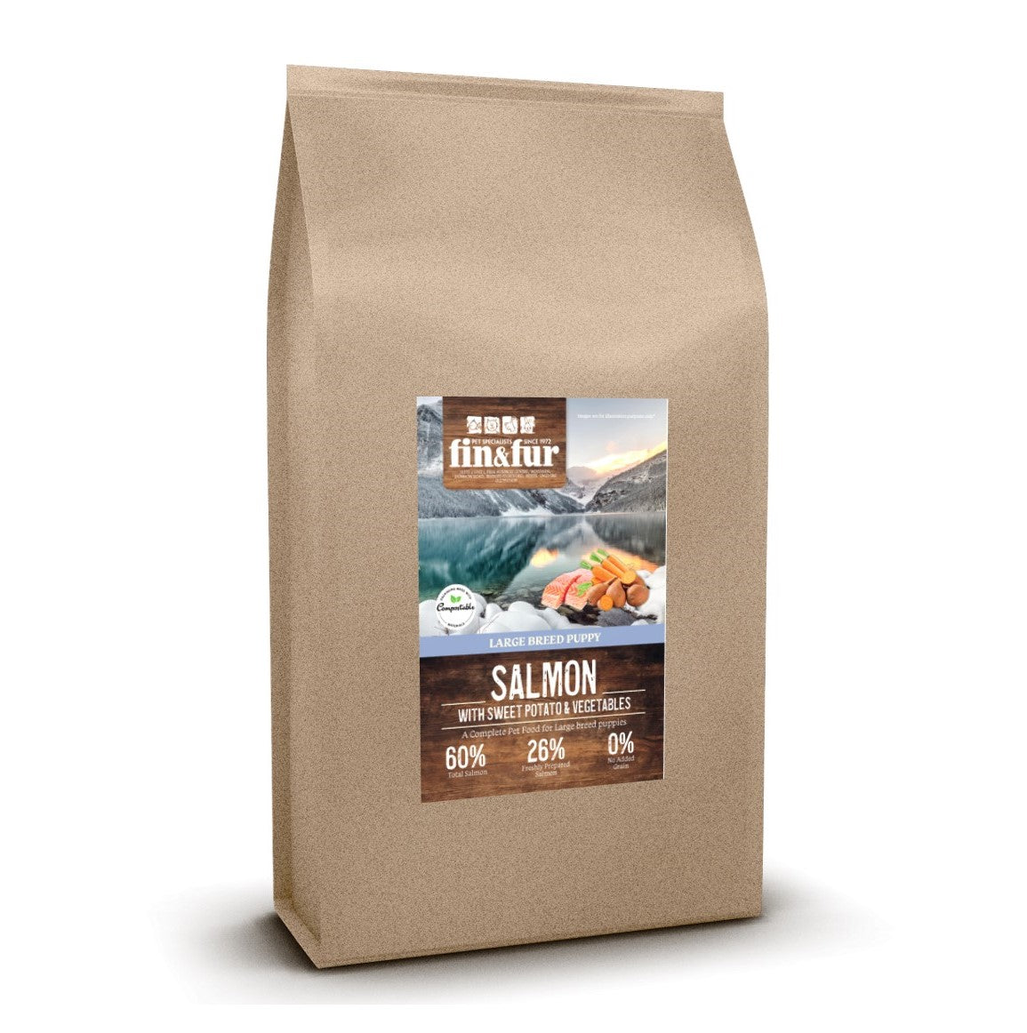 Fin & Fur Grain Free Large Breed Puppy/Junior Salmon & Sweet Potato is a natural, complete & balanced dog food with no added Grains.