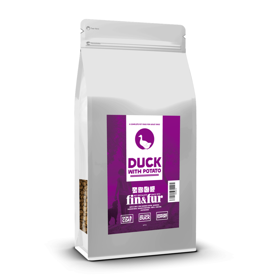 Fin & Fur Super Premium Duck & Potato is a palatable, hypo-allergenic complete food for adult dogs with no added Grains.