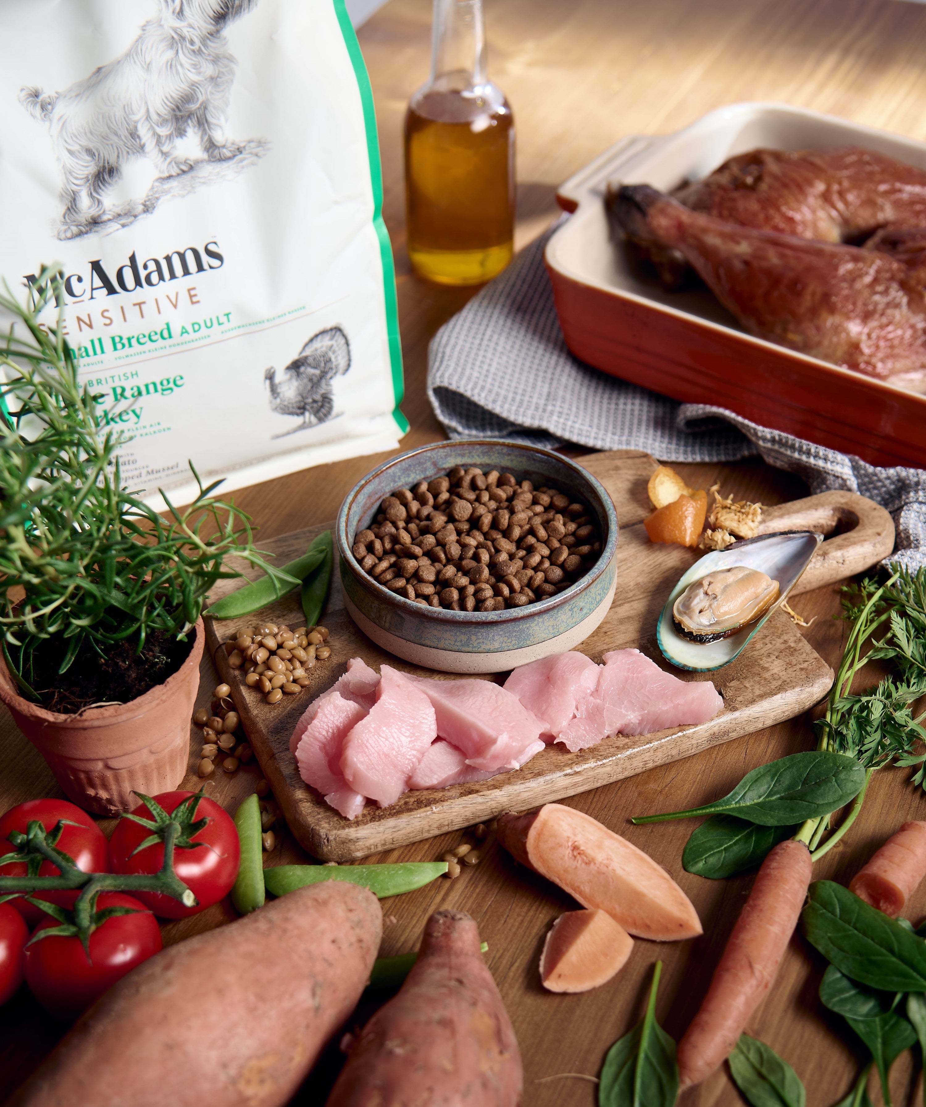 Most dry food is cooked quickly using steam, pressure, and very high temperatures (called extrusion), but McAdams is made differently. We gently bake our ingredients at low temperatures, and our succulent wet trays have real pieces of free range turkey gently cooked with garden vegetables.
