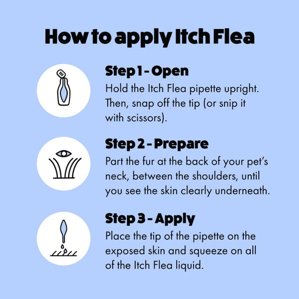 Fast-acting Itch Flea treatment for dogs is vet approved and scientifically proven to protect your pooch and your home from fleas. The double action spot-on flea treatment kills adult fleas within 24 hours, halts all other flea life stages in their tracks and stops any new fleas tormenting your dog. Plus it also kills ticks and lice.