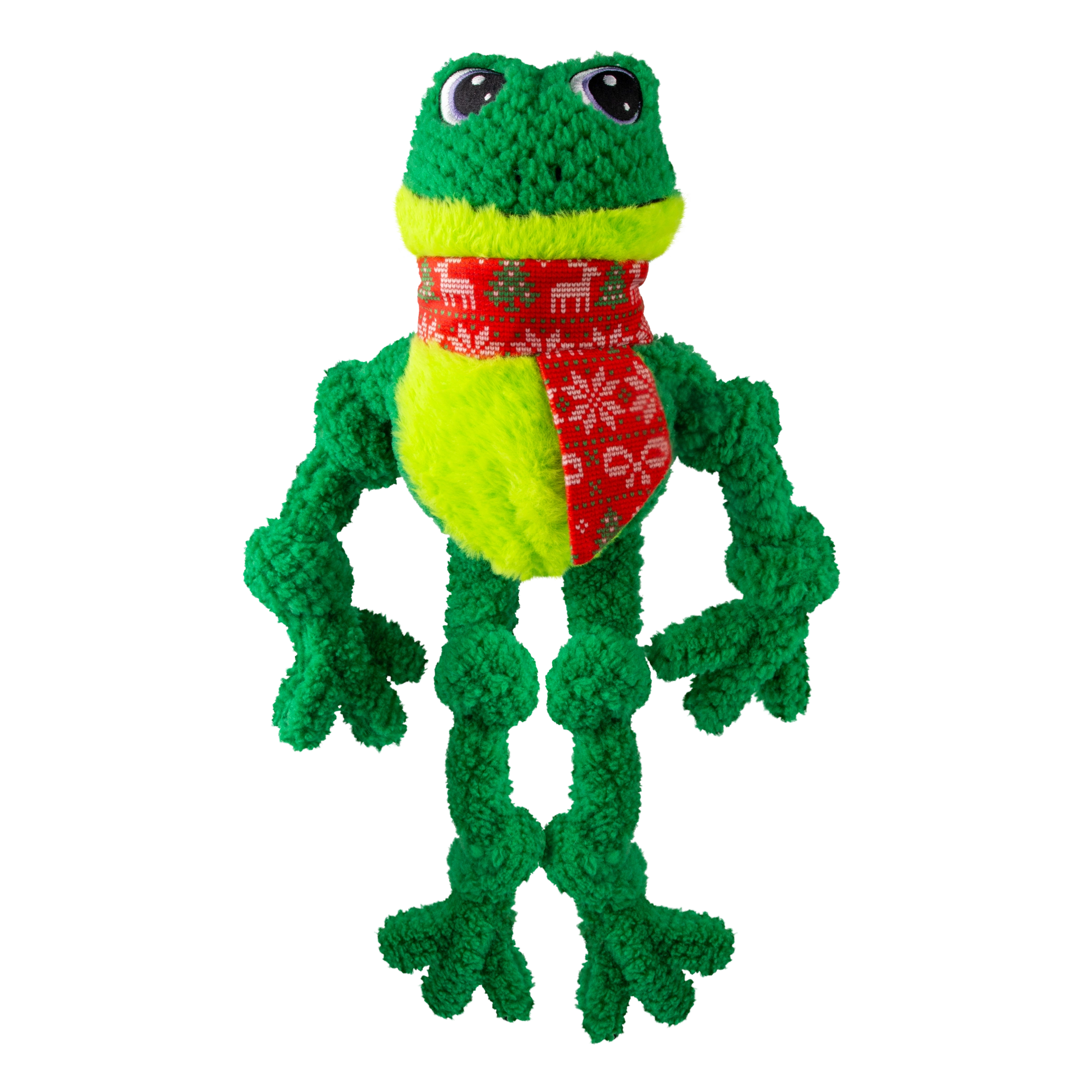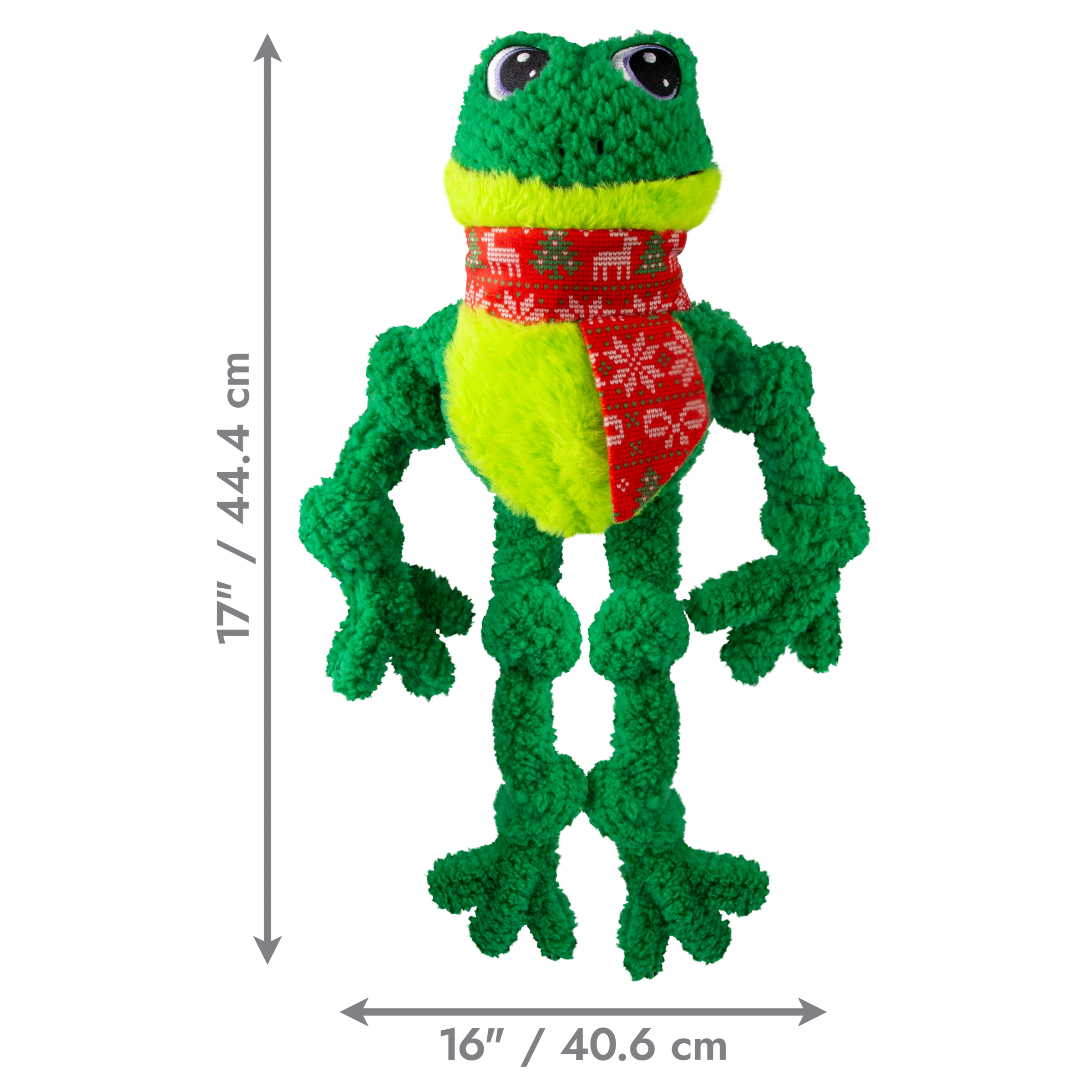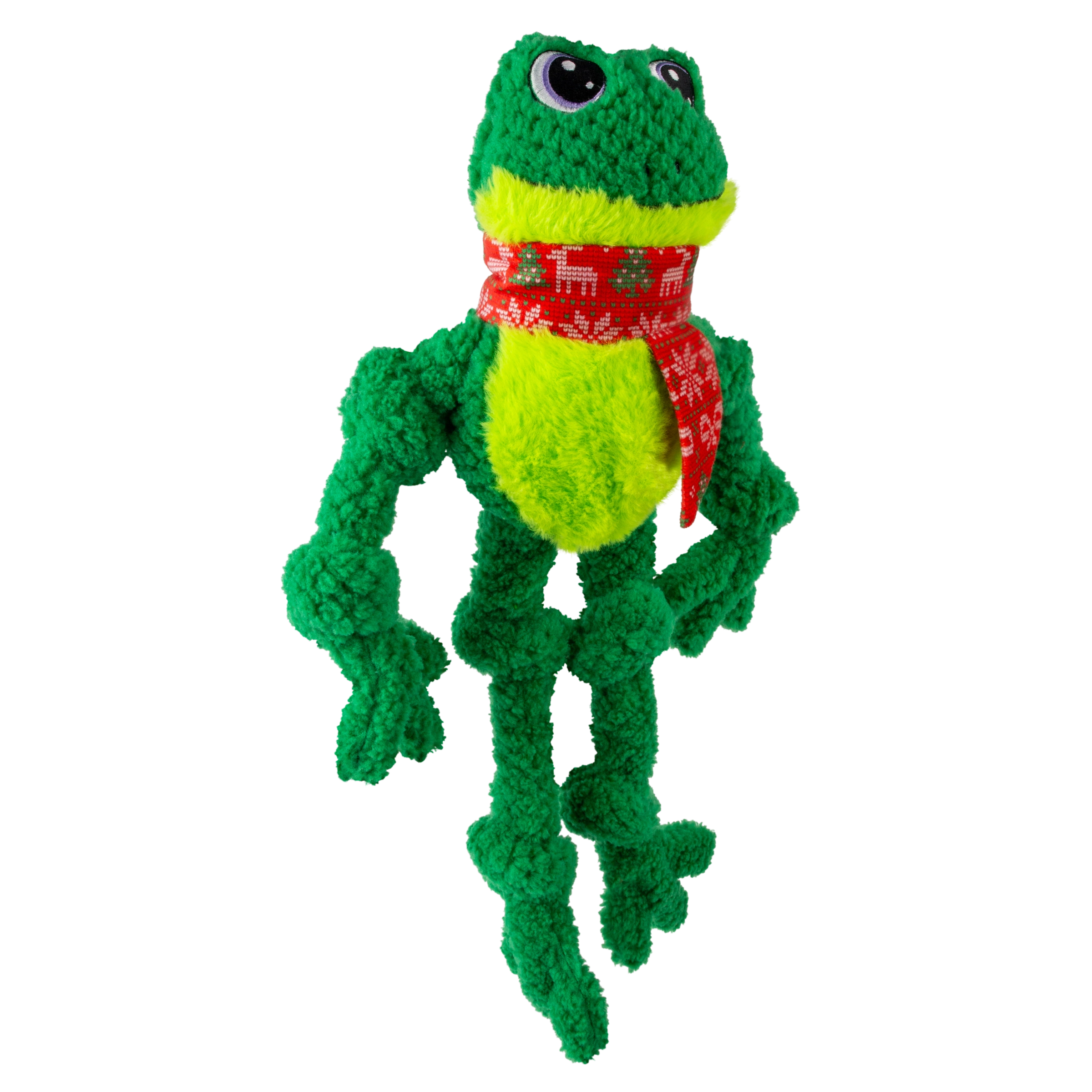 KONG Holiday Knots Frog is dressed for the season! This oversized amphibian’s full-body rope skeleton creates durability & heft for a variety of playstyles like tugging, thrashing, carrying, and gnawing. A squeaker in the head entices extended playtime, while its soft, dual-plush fur invites cuddling during quiet time. Unique details like cute froggy fingers and embroidered facial features make this frog the perfect gift for your furry best friend.
