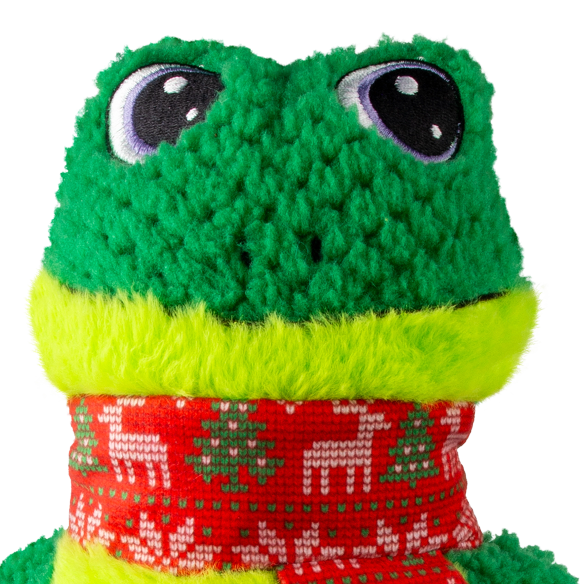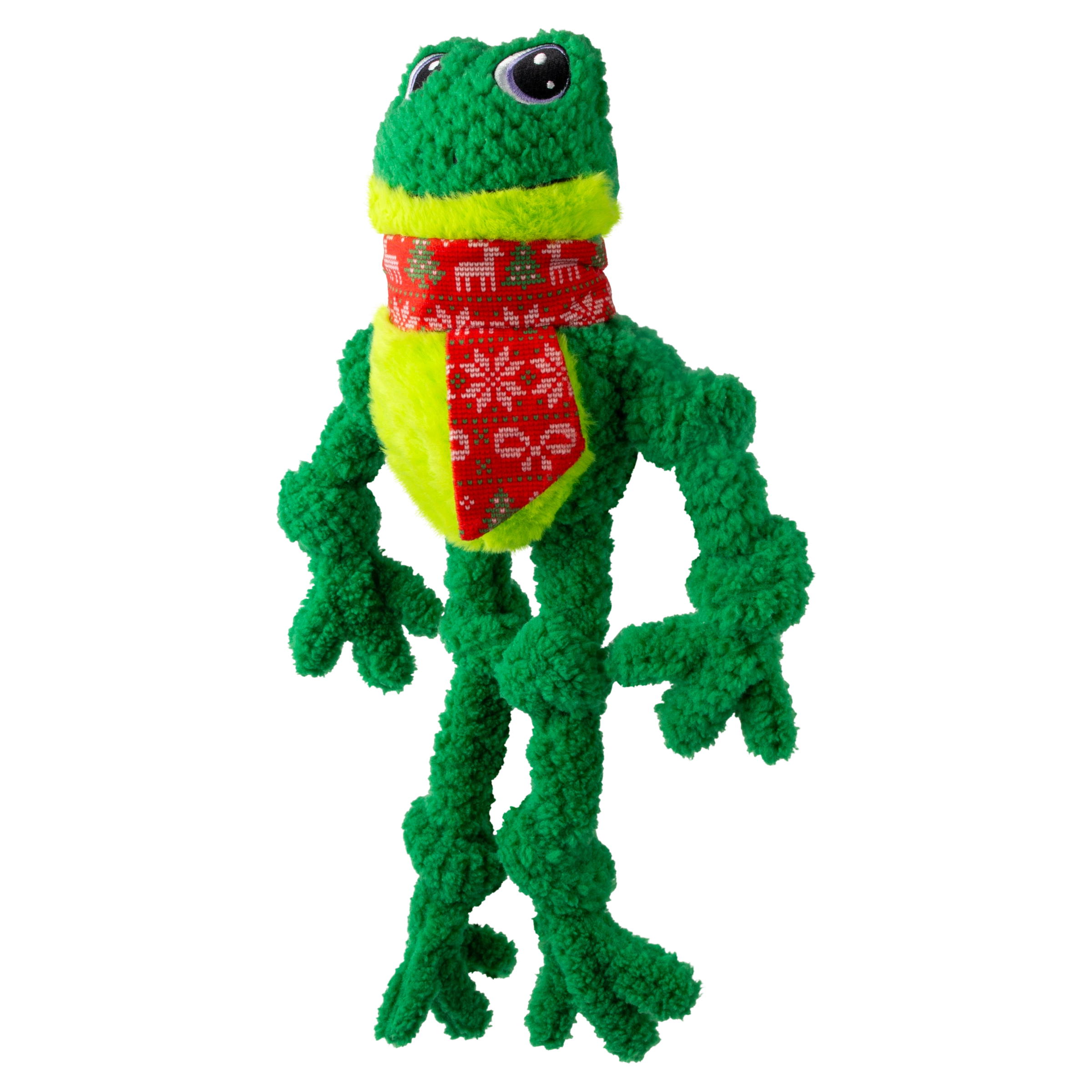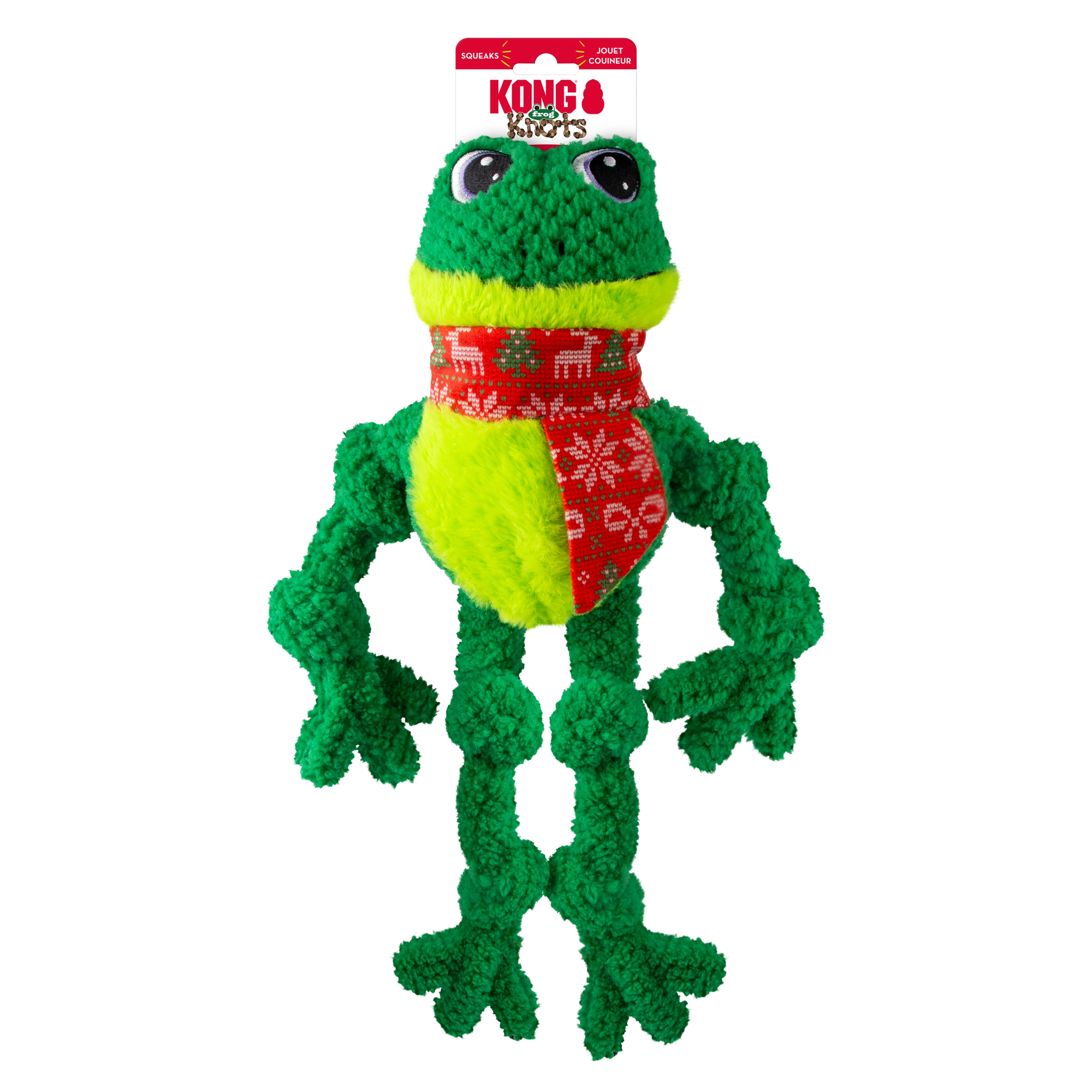 KONG Holiday Knots Frog is dressed for the season! This oversized amphibian’s full-body rope skeleton creates durability & heft for a variety of playstyles like tugging, thrashing, carrying, and gnawing. A squeaker in the head entices extended playtime, while its soft, dual-plush fur invites cuddling during quiet time. Unique details like cute froggy fingers and embroidered facial features make this frog the perfect gift for your furry best friend.